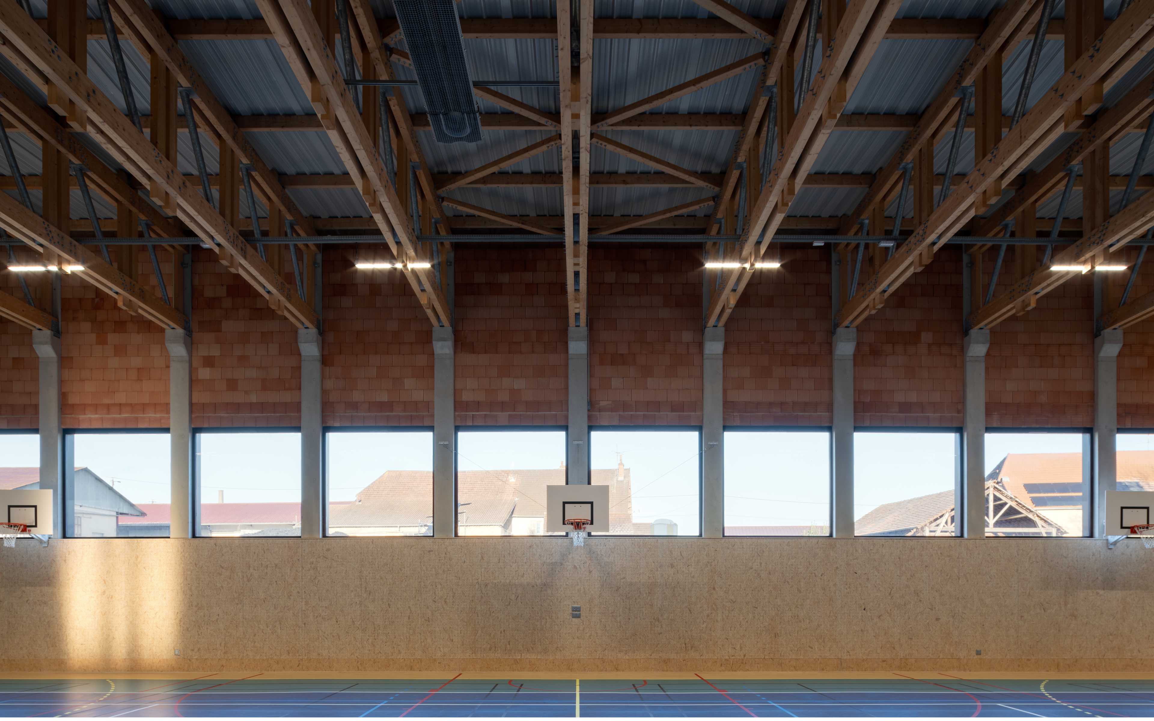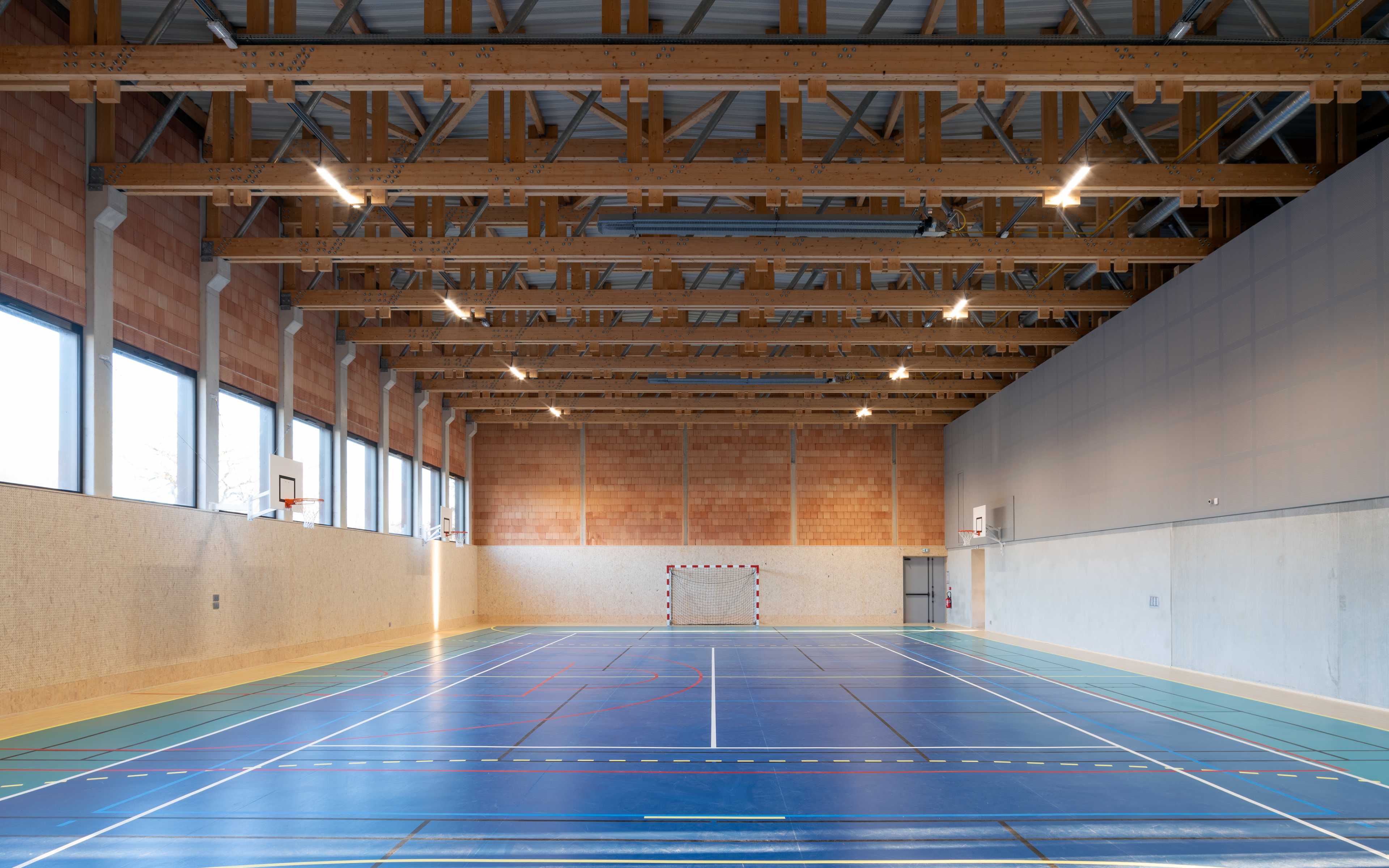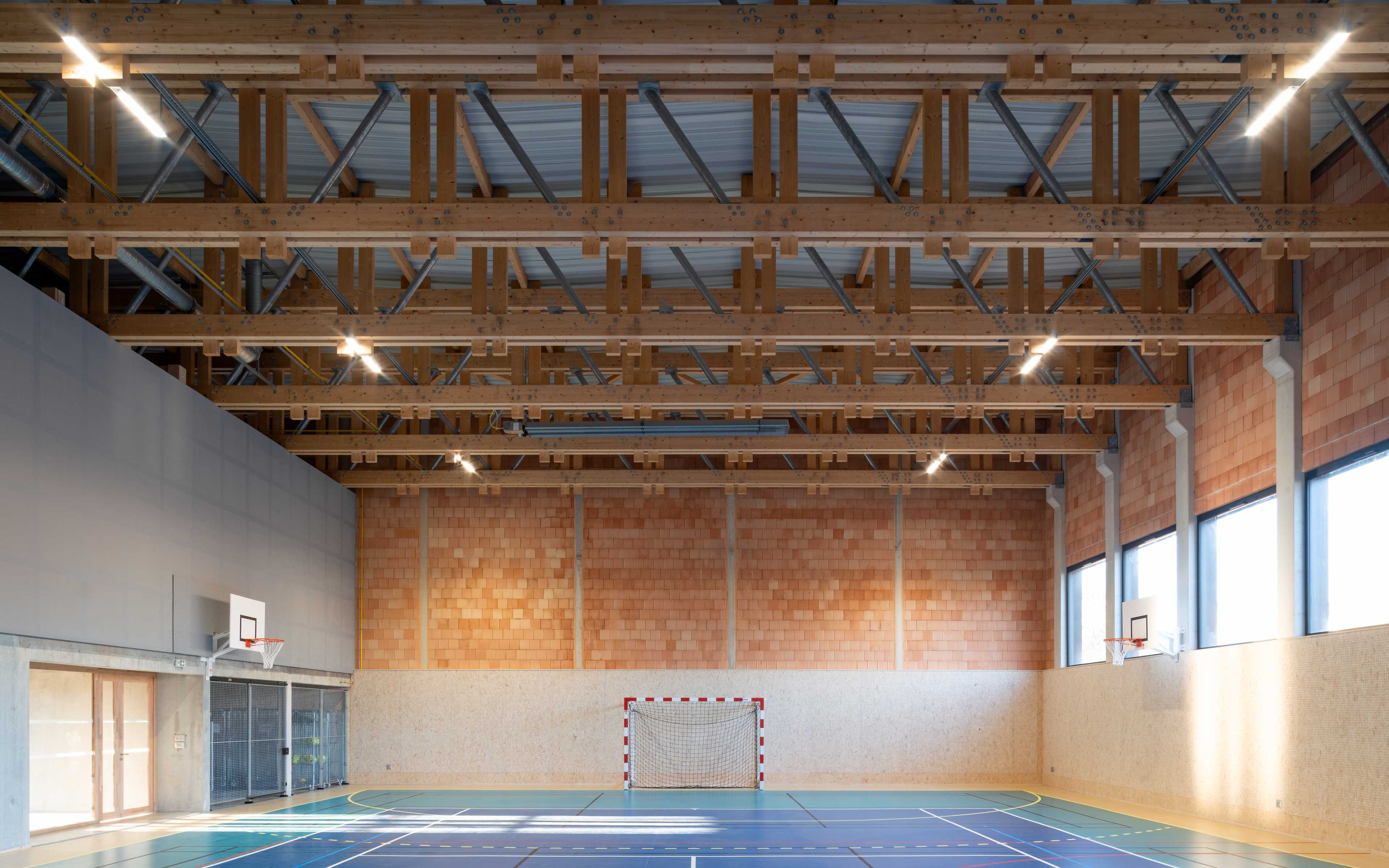 Entreprises : Lot 01 – Terrassement - VRD : SAS SLTP, Lot 02 – Renforcement du terrain : KELLER FONDATIONS SPECIALES, Lot 03 – Gros œuvre : SAS DAMIN, Lot 04 –Charpente bois – bardage : EURL MONAMY, Lot 06 – Menuiseries - extérieures aluminium - métallerie : PEGUILLET SARL, Lot 07 – Menuiseries intérieures : L’ATELIER DE LA MENUISERIE, Lot 08 – Doublages – cloisons – peinture : SARL FILIPPI, Lot 09 – Revêtement de sols sportifs : REALSPORT France, Lot 10 – Elévateur : MYD’L, Lot 11 – Plomberie – sanitaires : MOLIN SAS, Lot 12 – Electricité : SARL EJE, Lot 13 –Chauffage – ventilation : MOLIN SAS